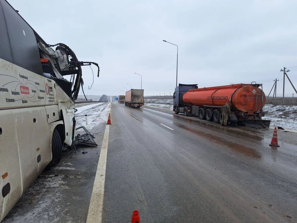38-летний водитель автобуса «Ютонг», следовавший из Москвы в Стаханов (ЛНР), не выбрал безопасную дистанцию и врезался в попутный бензовоз «Скания».