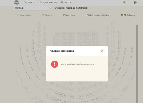 Так не бывает. Человек просто не способен столь быстро реагировать. Таким образом, либо при покупке билетов кто-то разработал специальные бот-программы, которые моментально реагируют на появление мест, либо таким образом «выбрасывают» места программисты Большого. Причём совершенно непонятно, почему появляются места по одному в разных концах зала. Два места рядом вообще забронировать невозможно.