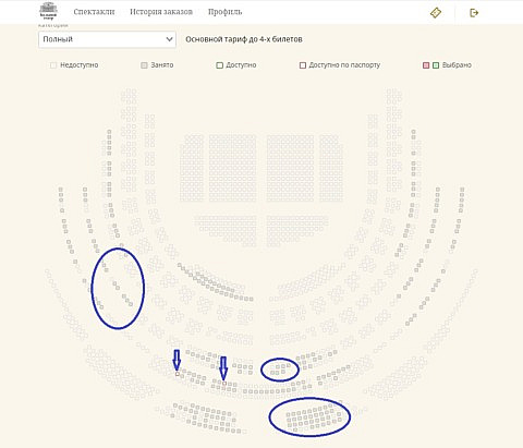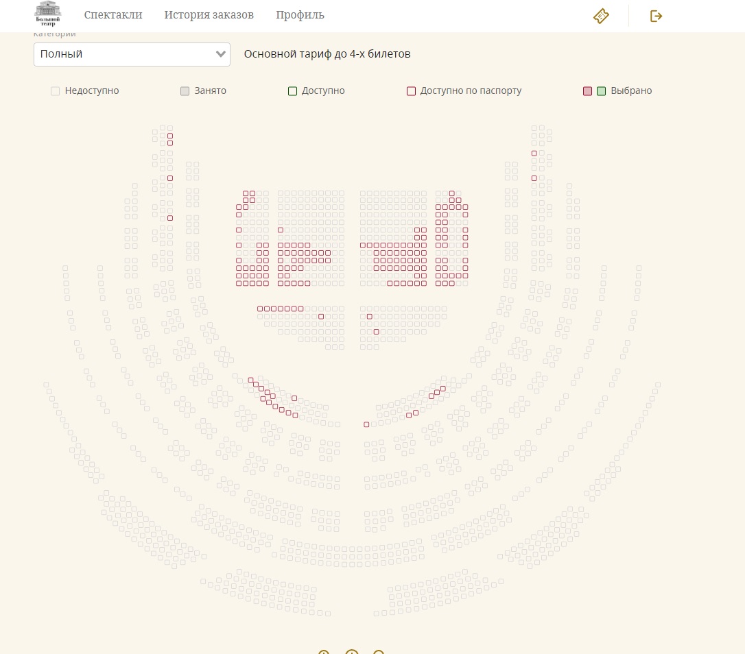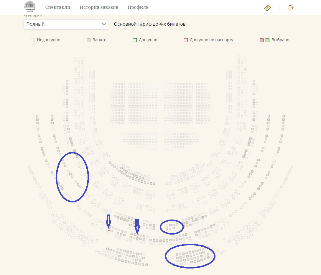 Вот страница покупки билетов на один из спектаклей в Большом. Выставлены все свободные места, они в красных квадратиках – продаются по паспорту. Можно выбрать хотя бы два рядом.