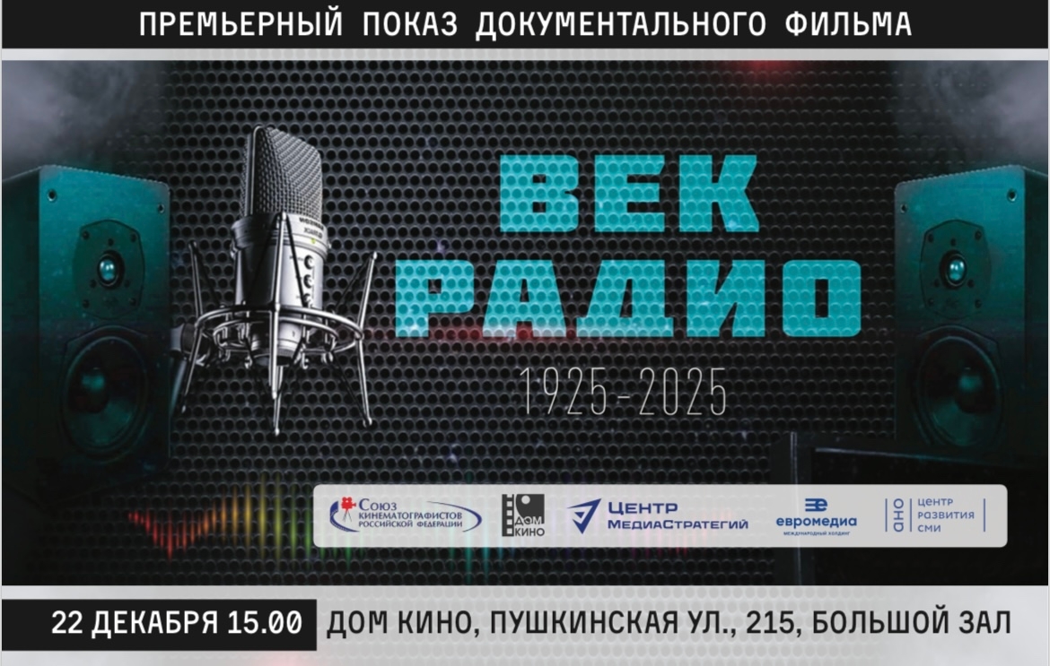 Премьера документального фильма «Век радио» пройдет 22 декабря в Большом зале Дома кино в г. Ростове-на-Дону.