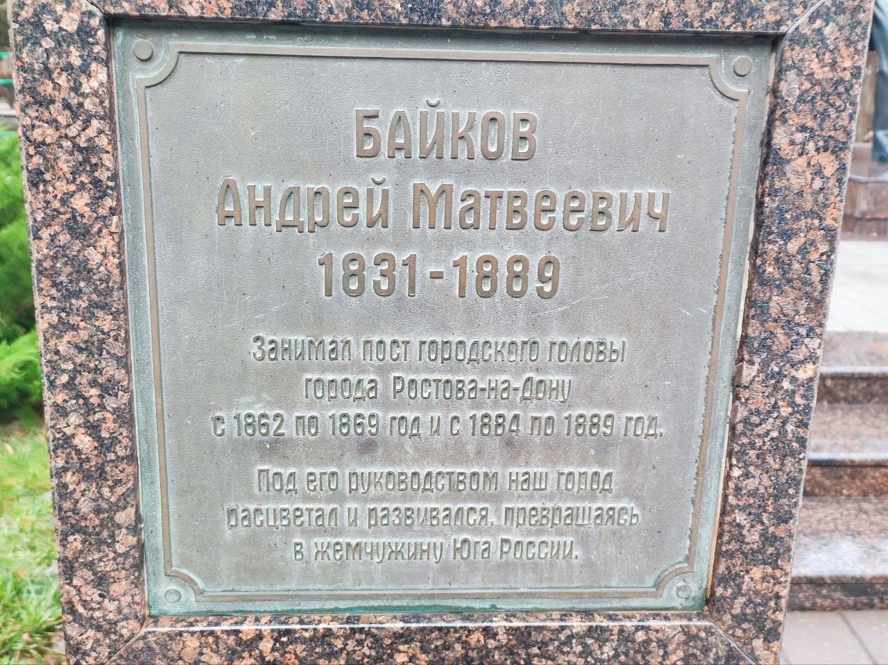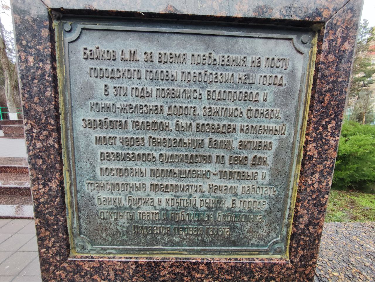 При Байкове Ростов обзавёлся тротуарами, первыми фонарями, общественным транспортом, богадельней, газетой, обществом взаимного кредита, биржей. Появились пожарная команда, набережная и сады.