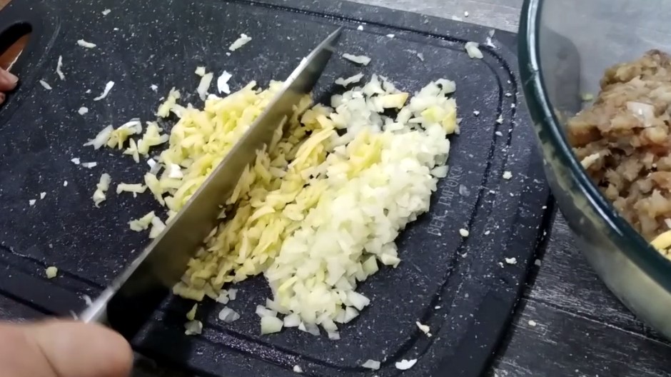 1. Филе селёдки нарезаем на очень мелкие кубики. Можно пропустить на крупной решётке мясорубки, но в оригинале всё нарезается ножом. Складываем нарезанную селёдку в чашку.