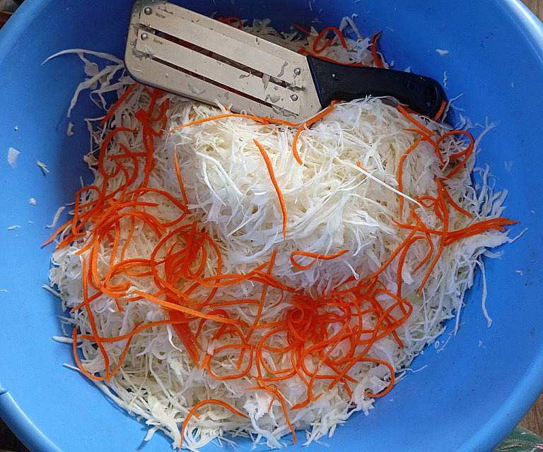 2. Морковь можно натереть на крупной тёрке, а можно использовать тёрку для корейской моркови. На ней морковь натирается длинной и тоненькой. Красиво. Чем больше моркови, тем более окрашена будет капуста. Если вы любите капусту белую, то моркови берите немножко.