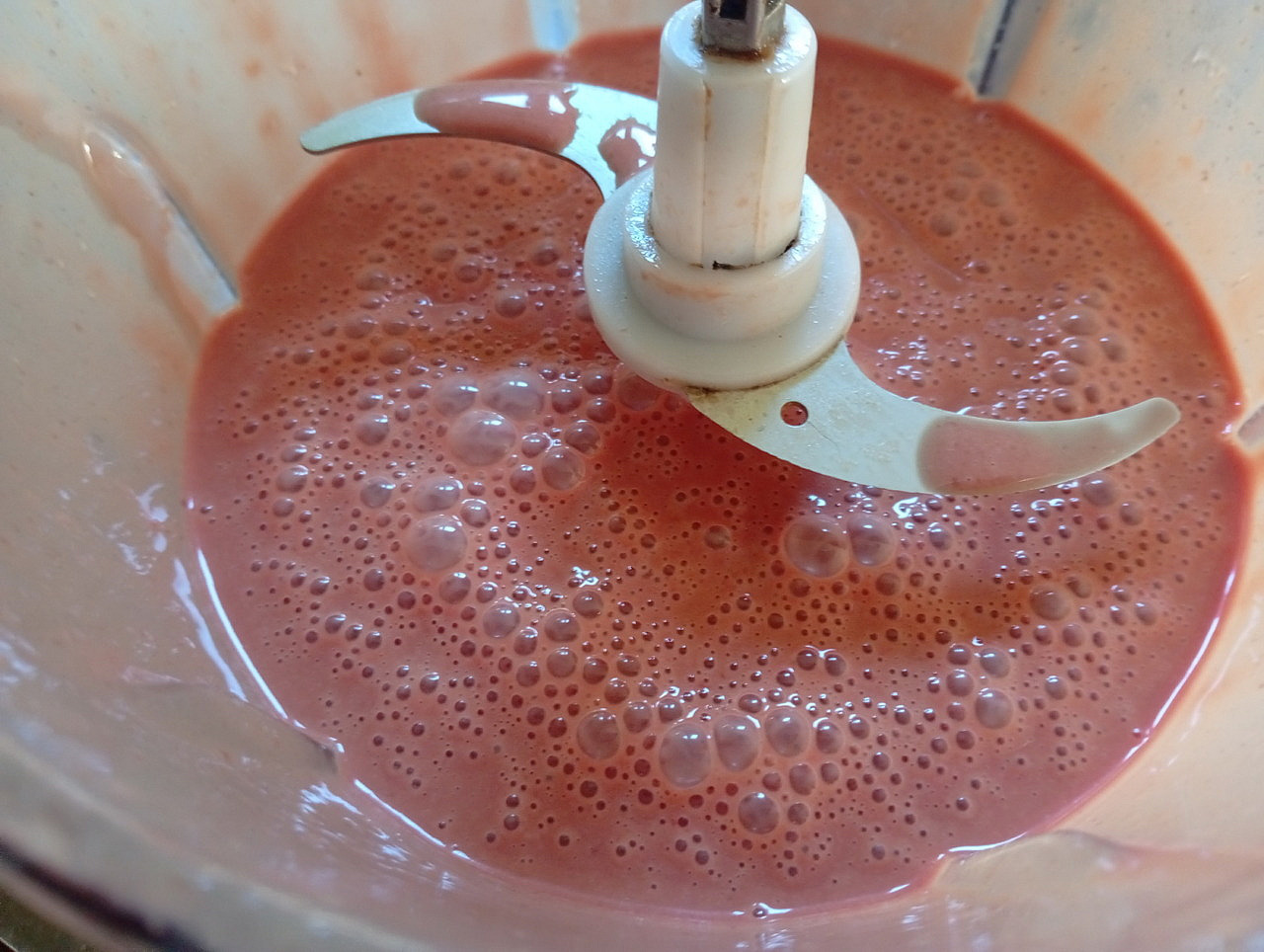 2. Протираем полученную массу через дуршлаг и выливаем опять в блендер. Сливочное масло растапливаем и добавляем к печёночной массе. Туда же яйца. Ещё раз тщательно смешиваем.