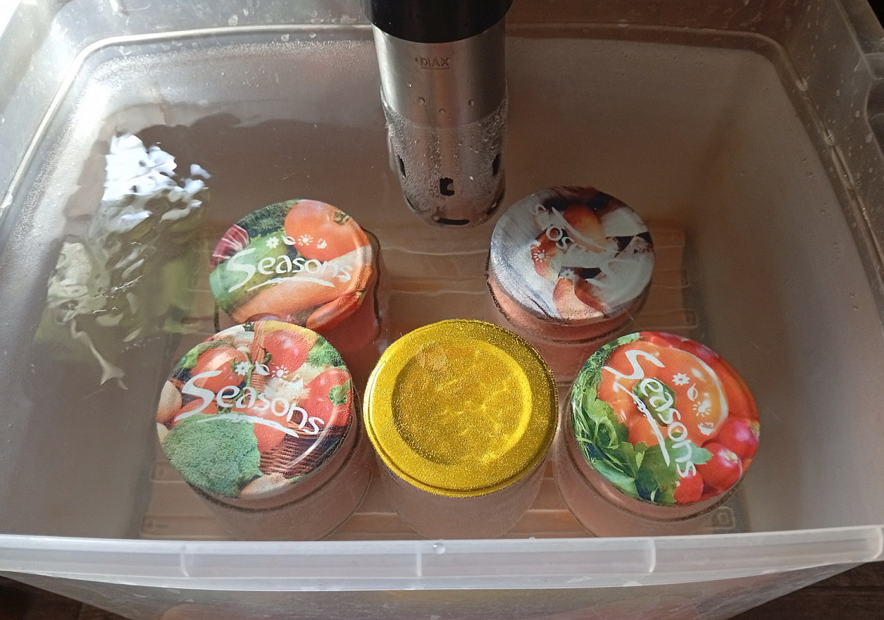 3. Разлить массу по банкам и закрутить крышками. Теперь три способа приготовления - в сувиде, на плите сверху и в духовке. В любом случае выставляем температуру 70*С, банки опускаем в воду (если в духовке, то в кастрюле) так, чтобы вода банки полностью закрывала. Время приготовления - 3 часа с момента достижения температуры 70*С.