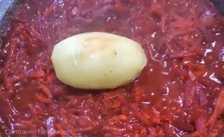 6. Нарезаем картофель любой формы — квадратики или брусочки. Нарезаем капусту, болгарский перец. Достаём из бульона картофелину, которую опустили в самом начале, она уже сварилась. Кладём к овощам в сковородку и измельчаем вилкой. Можно этот пункт пропустить, но я всегда так делаю, борщ становится гуще и вкуснее благодаря этой картофелине.