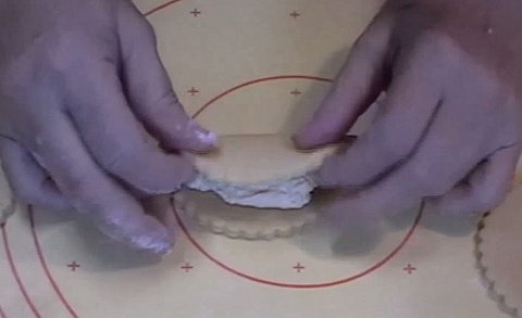 1.Достаем тесто из холодильника, раскатываем пласт или отрываем по кусочку и раскатываем поштучно. Вырезаем круглые или овальные заготовки. На один край кладем начинку, вторым краем прикрываем сверху, уголки чуть-чуть защипываем.