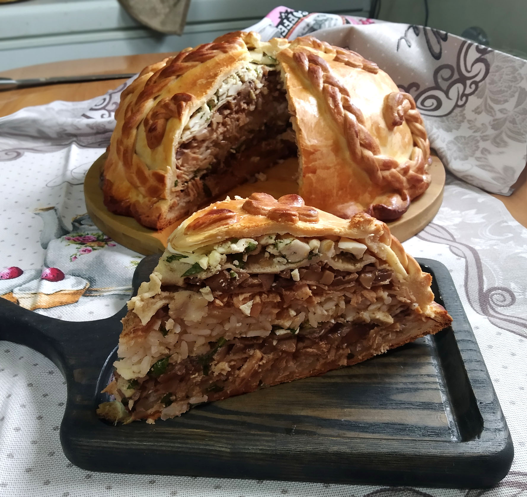 Вариантов приготовления этого удивительного пирога, который прячет под тоненькой корочкой теста целый обед, много. Разные начинки, разное тесто, но я хочу поделиться с вами рецептом праздничного, скорее даже свадебного, курника.
