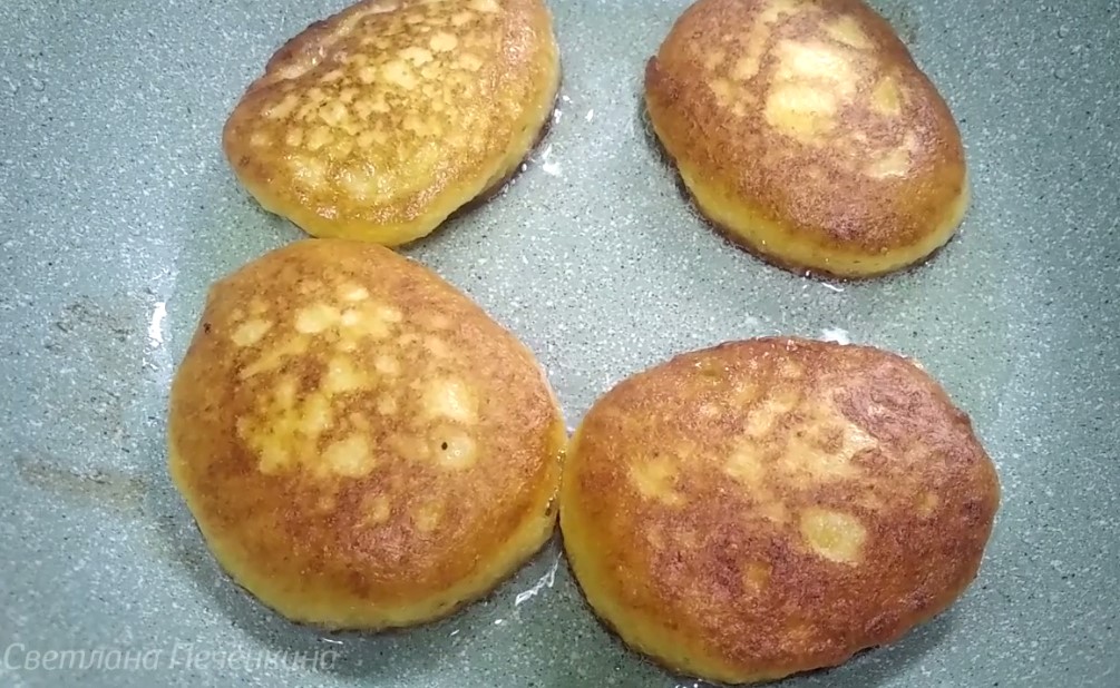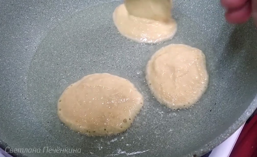5. В сковороду наливаем растительное масло (3-4 ст.л.), прогреваем и ложкой выкладываем тесто. Обжариваем с одной стороны, потом переворачиваем и обжариваем с другой стороны. Готовые оладьи кладём на бумажное полотенце, чтобы излишки масла впитались в него.