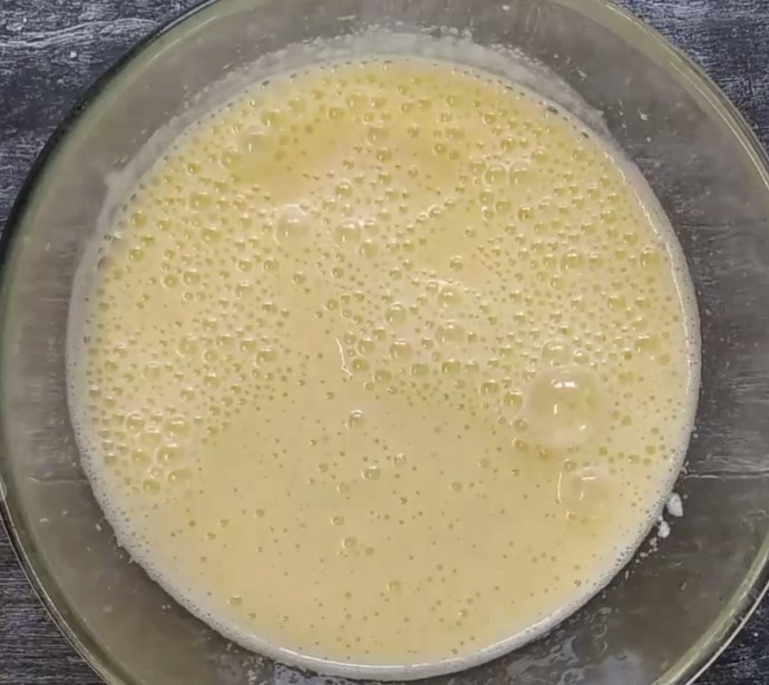 1. Заранее просеянную муку смешиваем с солью и разрыхлителем в отдельной чашке. Берём другую чашку и взбиваем в ней яйца с сахаром. Можно воспользоваться миксером или просто взять венчик. Миксером, конечно, быстрее. Смесь должна побелеть и увеличиться в размере. Вливаем кефир, растительное масло и снова всё смешиваем до однородности.