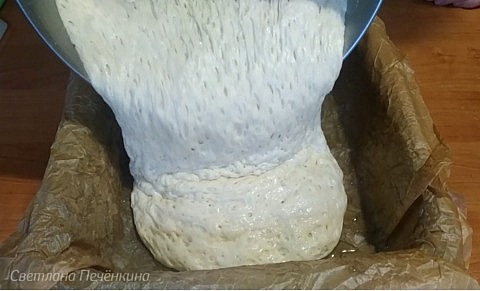 2. Форму для выпечки застилаем бумагой. Тесто увеличилось в 2-3 раза. Теперь нужно аккуратно выложить его в форму, не давая осесть. То есть, тесто больше не перемешиваем, а просто выливаем в форму.