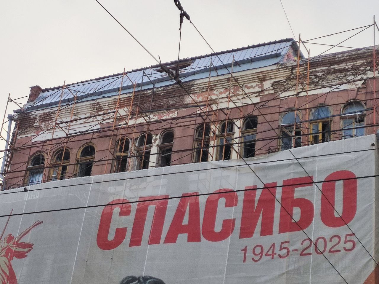 Здание, больше похожее на рейхстаг в мае 1945-го, уже который год завешивают "победными" баннерами, о чём мы рассказывали и несколько лет назад. И висят эти баннера, не прикрывающие полуразрушенное здание полностью, едва ли не от мая до мая.