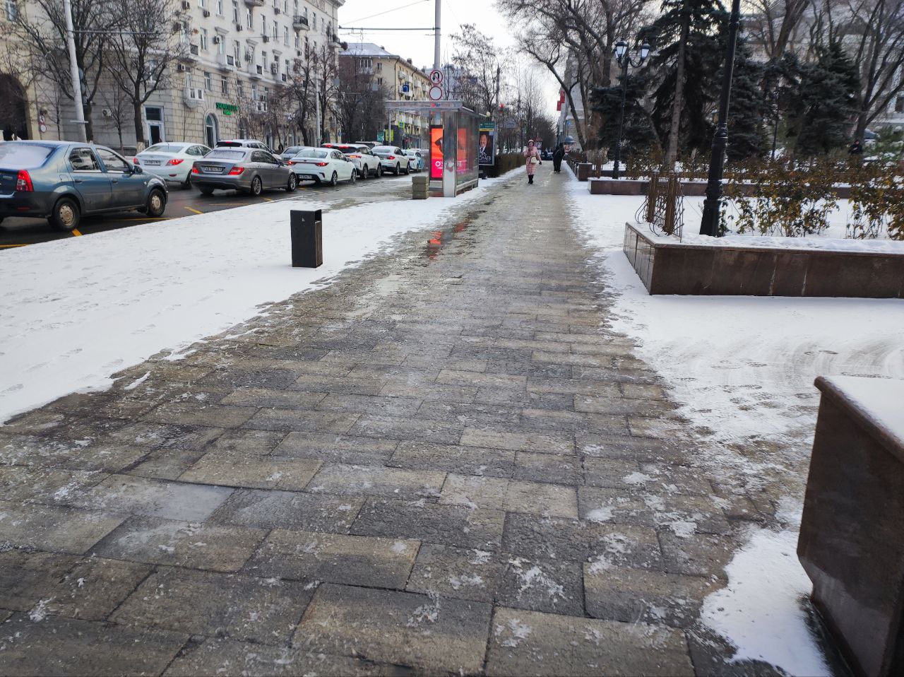 Одна из наиболее сложных улиц - Большая Садовая. Здесь перед ЧМ-2018 постелили большую гладкую плитку. В гололёд здесь сплошной каток без зацепок. При хорошем ветре на ногах можно доехать без проблем от Театральной до Будённовского :)
