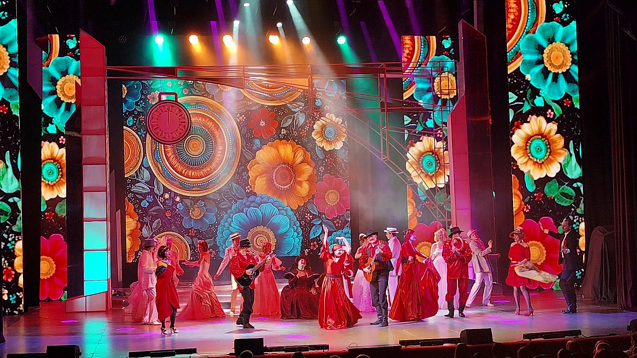 Это, в общем, праздничная программа, где основа постановки – множество красочных музыкальных номеров различных жанров, связанных между собой исторической темой и традициями празднования Нового года – начиная с древних времён и до наших дней.