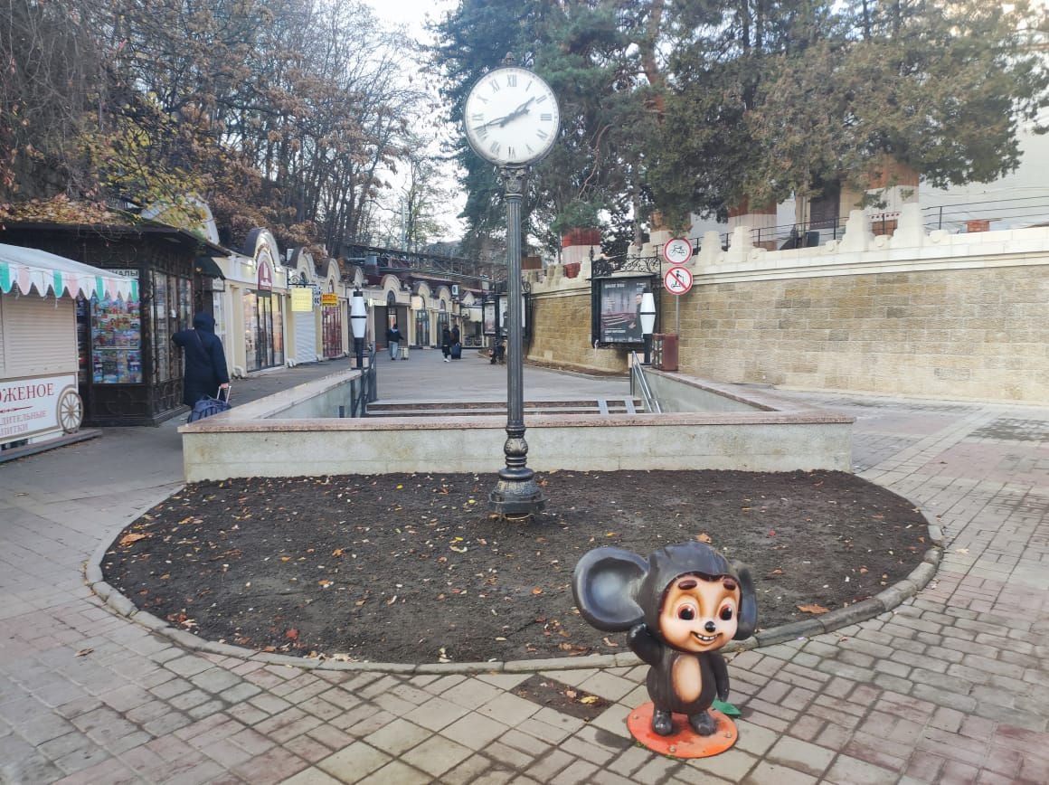 Здесь же, в Кисловодске, минеральная вода, горы, воздух и - тотальный Чебурашка.