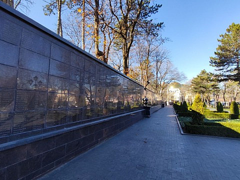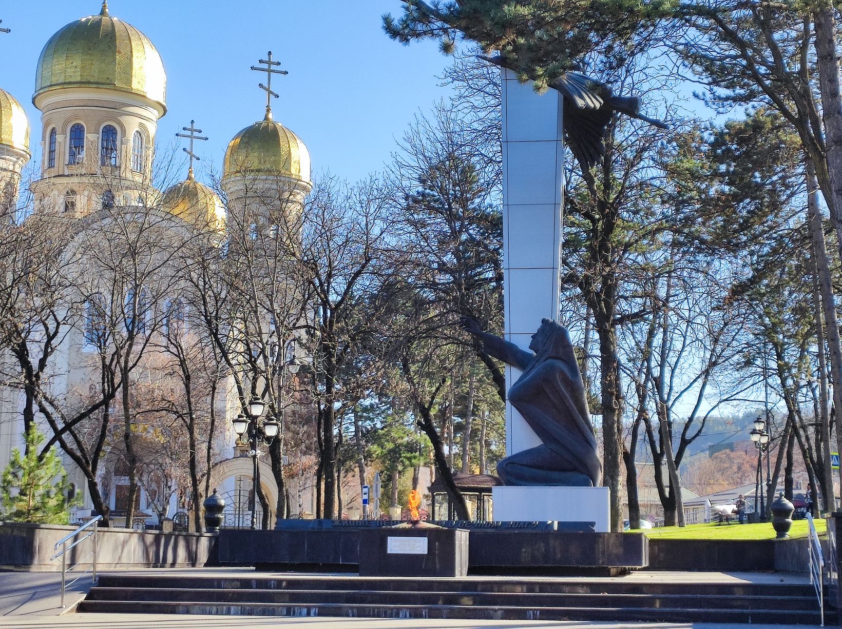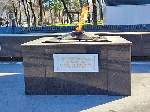Здесь горит Вечный огонь. Возле монумента воздвигнута величественная «Стена памяти» - на ней выбиты более 5,5 тысячи фамилий, не вернувшихся с войны кисловодчан. На постаменте находится надпись: «Живущие перед вами в вечном долгу».