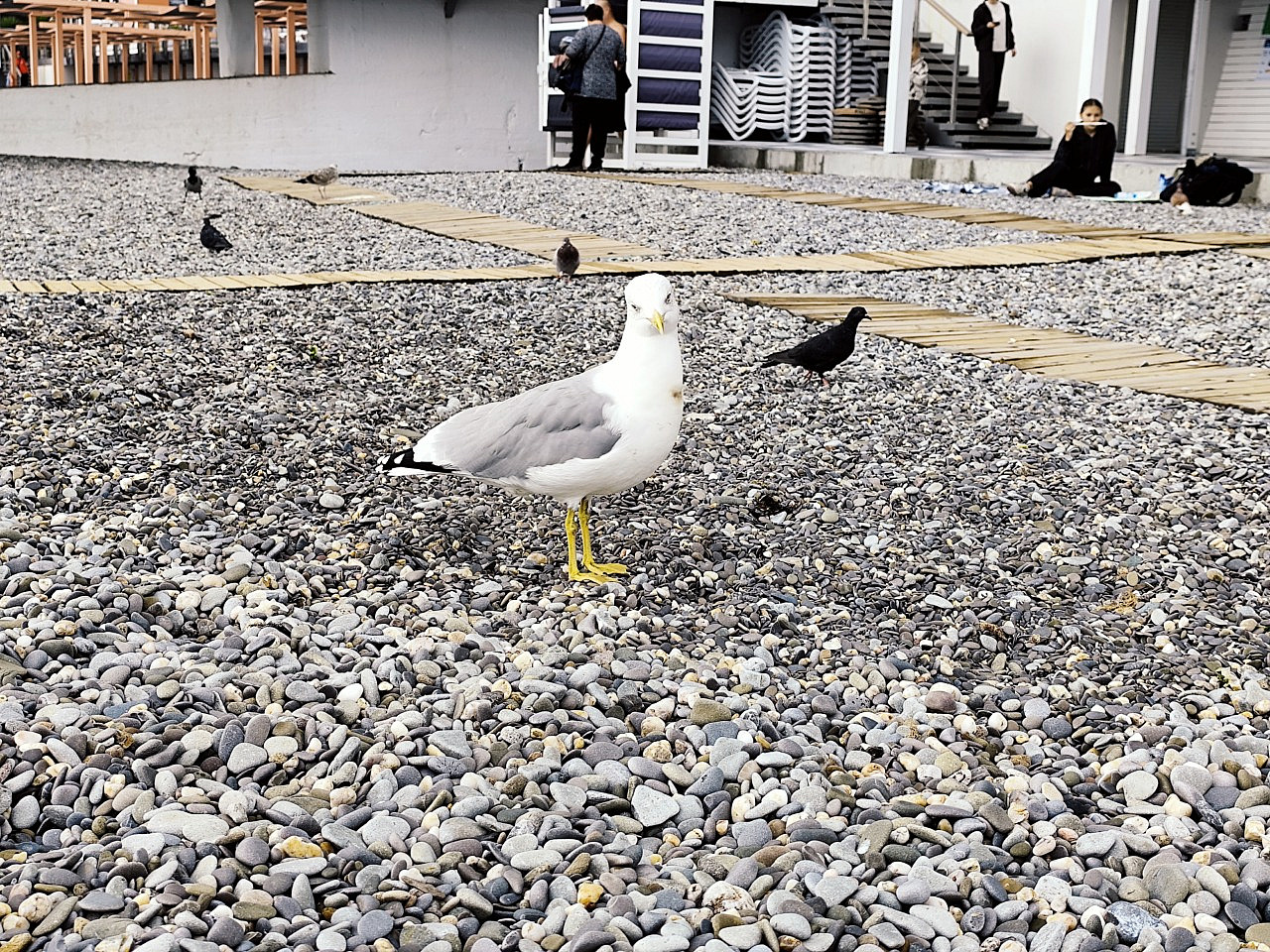 Тут же снуют голуби и воробьи, но стараются не вызывать гнев находящихся здесь же чаек. Ну, а если и ухватил кусочек чего-то съедобного, то нужно быстро удирать.