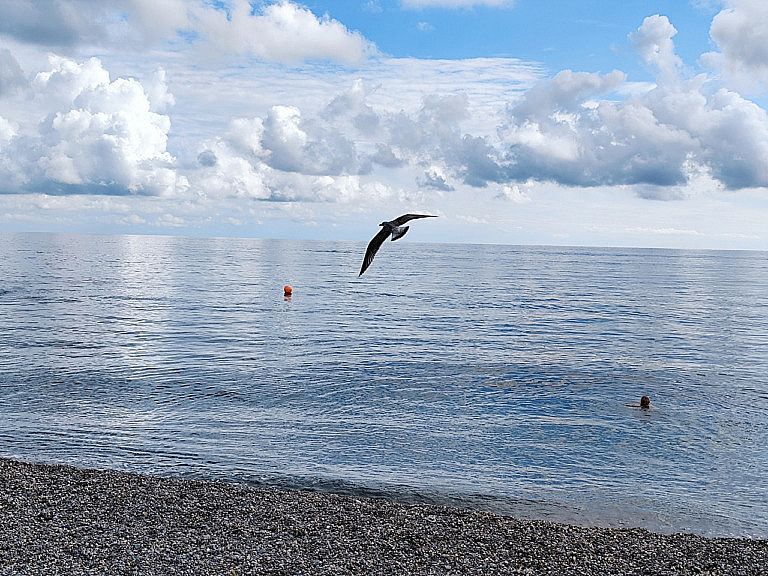 Да, на пляжах сейчас малолюдно, но купаться ещё можно. Правда, решаются на это далеко не все. В основном люди, по-осеннему утеплившись и прихватив с собой бутерброды, отдыхают, уютно устроившись на пляже, – любуются пейзажами, созерцают водную гладь, белые кучевые облака, которые плавно плывут на контрастно-синем небе…