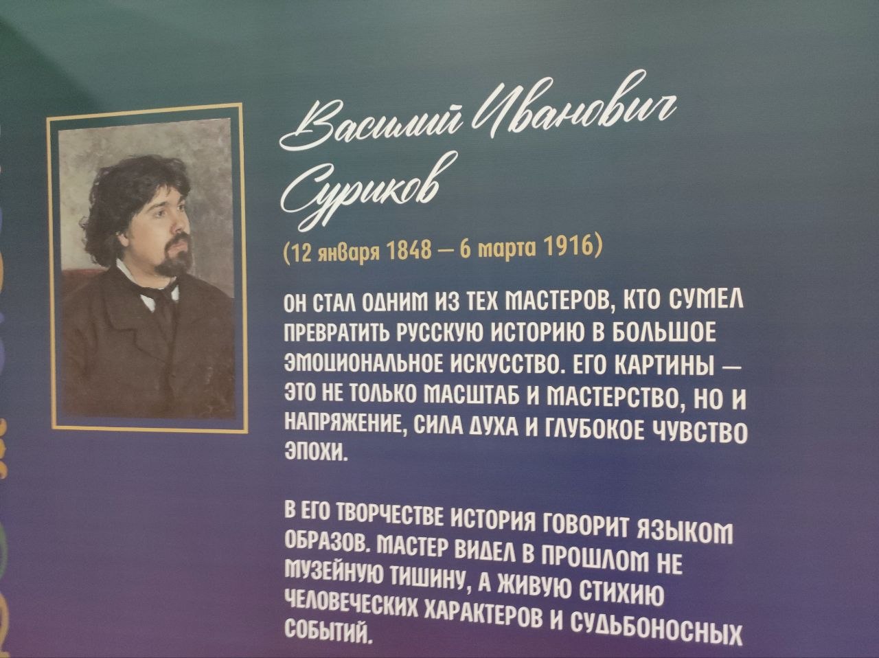 На этой выставке демонстрировался фильм из серии «Ожившие полотна», посвящённый жизни и творчеству Василия Ивановича Сурикова.
