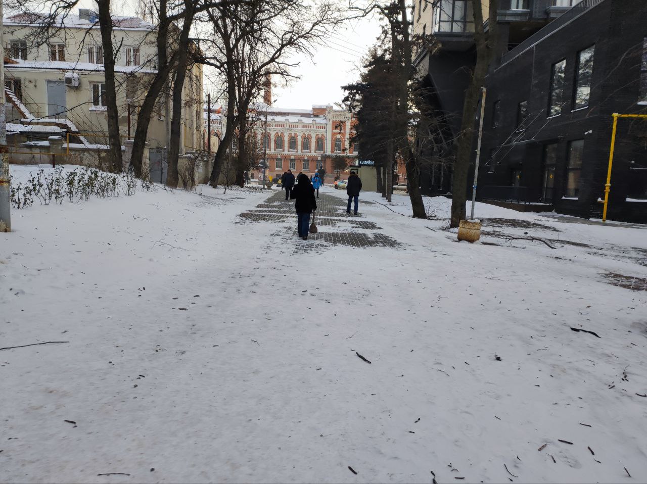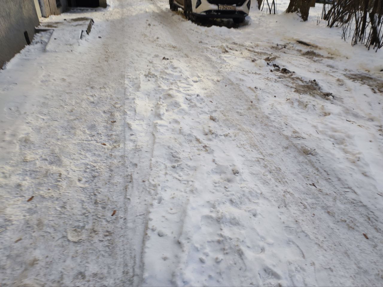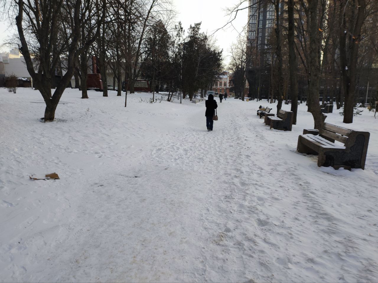 Если дороги в основном расчищены и обрабатываются антигололёдными материалами, то пешеходные дорожки даже в местах высокого трафика остаются утоптанными и уже становятся гололёдными.