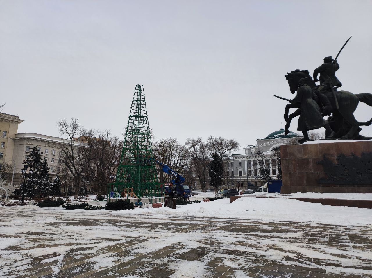 Разбирают ёлку и на площади Советов. Как-то даже жалко стало. Стояла себе, сияла по вечерам, украшала место.