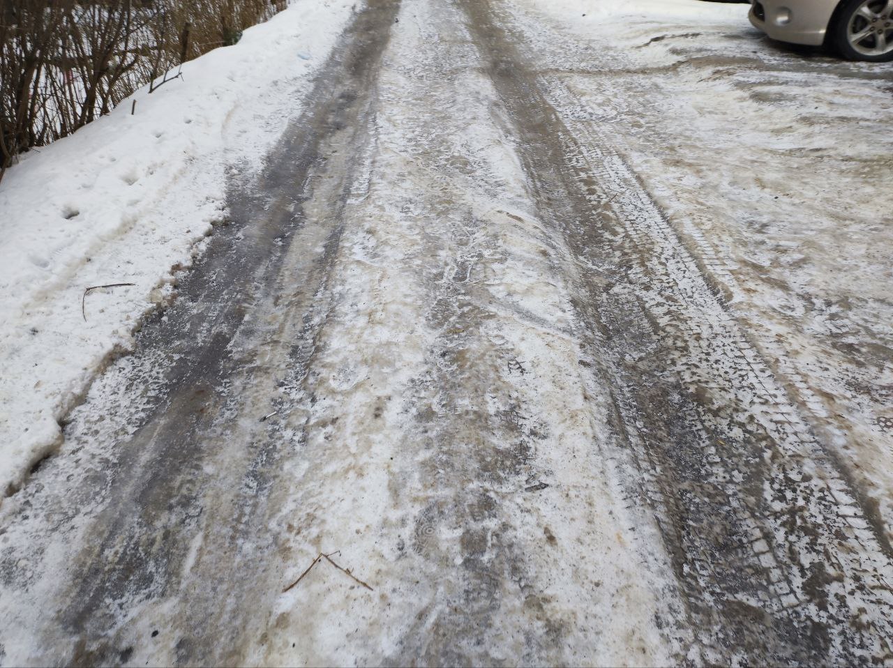 Вообще-то причина есть. По всей видимости, это гололёд во дворах. Колеи накатали легковые авто - по всей видимости, "КамАЗ" в них не помещается. К тому же у самих площадок - уклон, машина может скользить.