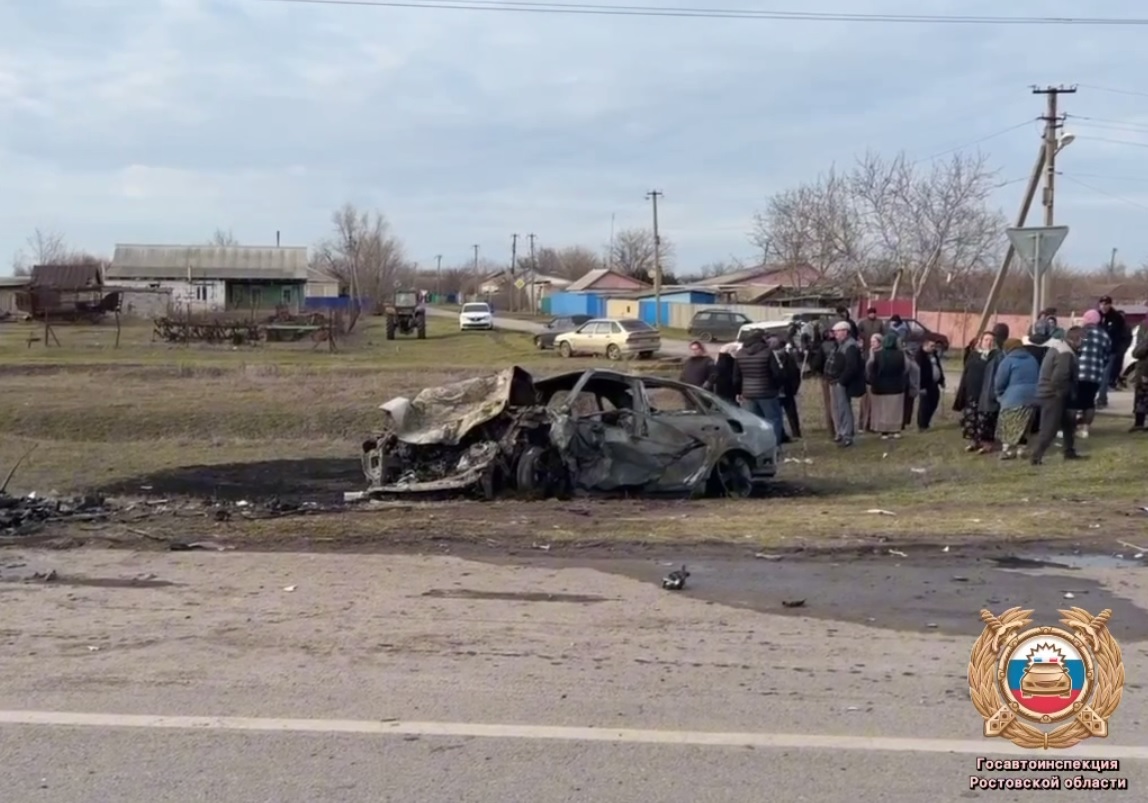 Автомобиль загорелся. В ГАИ РО сообщают о трёх погибших. Следователи работают на месте аварии.