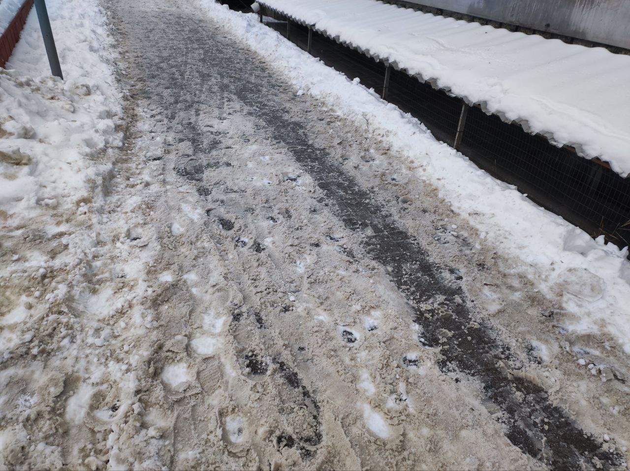 Что интересно, гололёд в основном на расчищенных тротуарах. Там, где не расчищено до конца да к тому же посыпано антигололёдными материалами, - мерзкая неприятная кашица, но не гололёд.