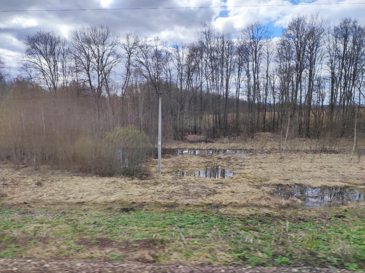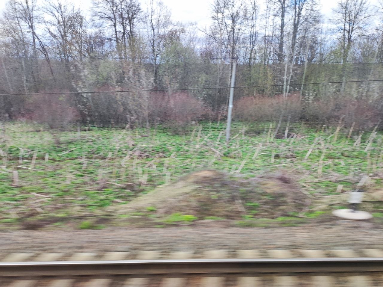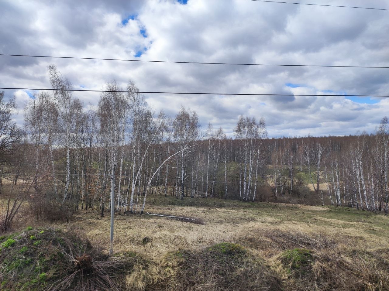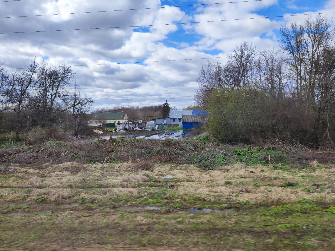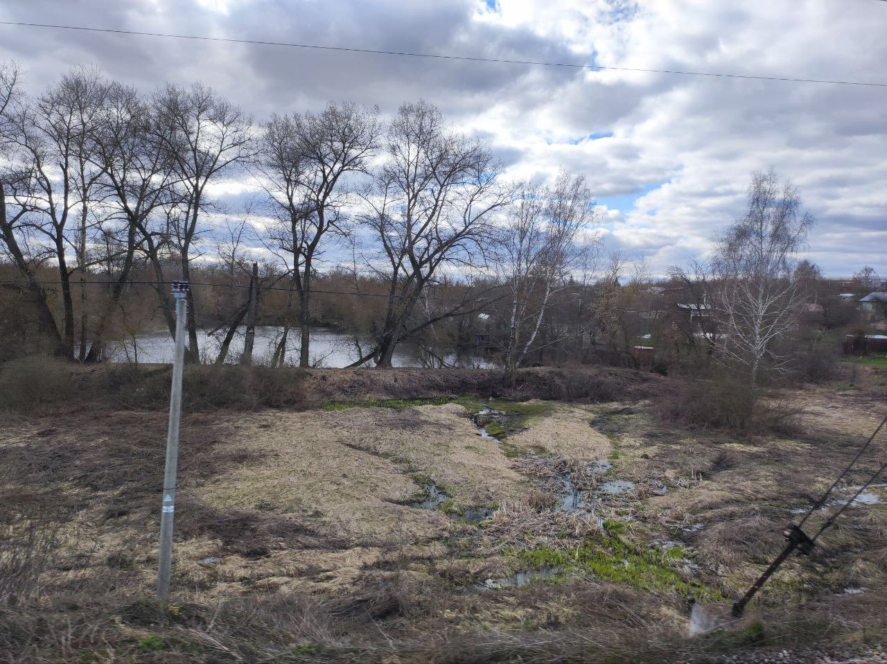 У нас уже бушует зелень, отцветают тюльпаны, сирень врывается в окна, а тут - чахлые перелески и рощицы Средней Руси, ещё не до конца стаявший снег, чёрная пугающая вода болотцев, бледные и беспомощные берёзки и осинки да засохшие с прошлого года заросли борщевика, с который и бороться-то уже бесполезно. Завезли его когда-то на эти бедные земли, чтобы было чем коровок кормить, а он возьми да и приживись - не справиться...