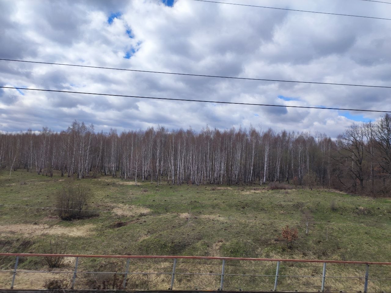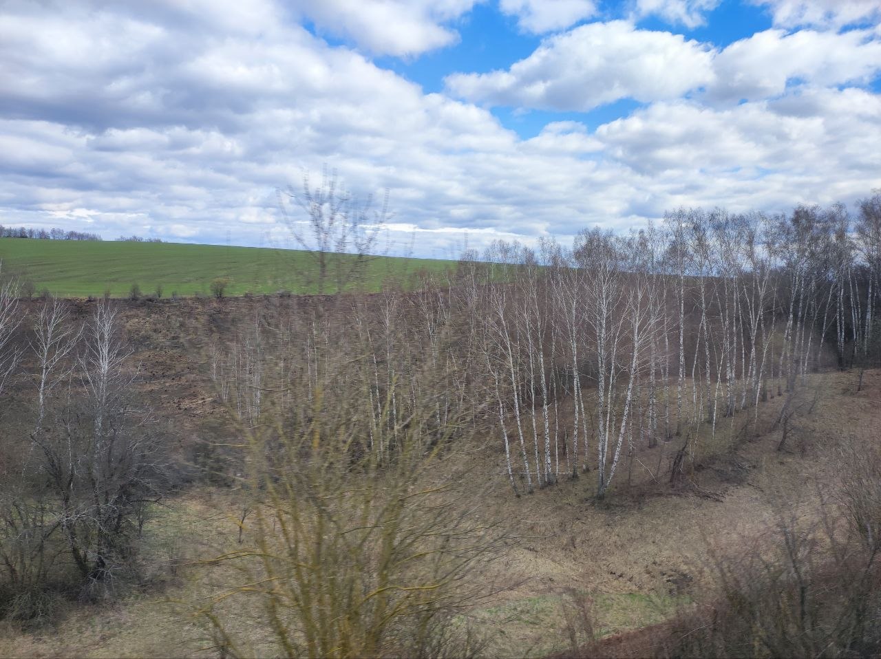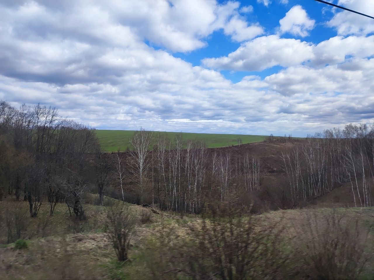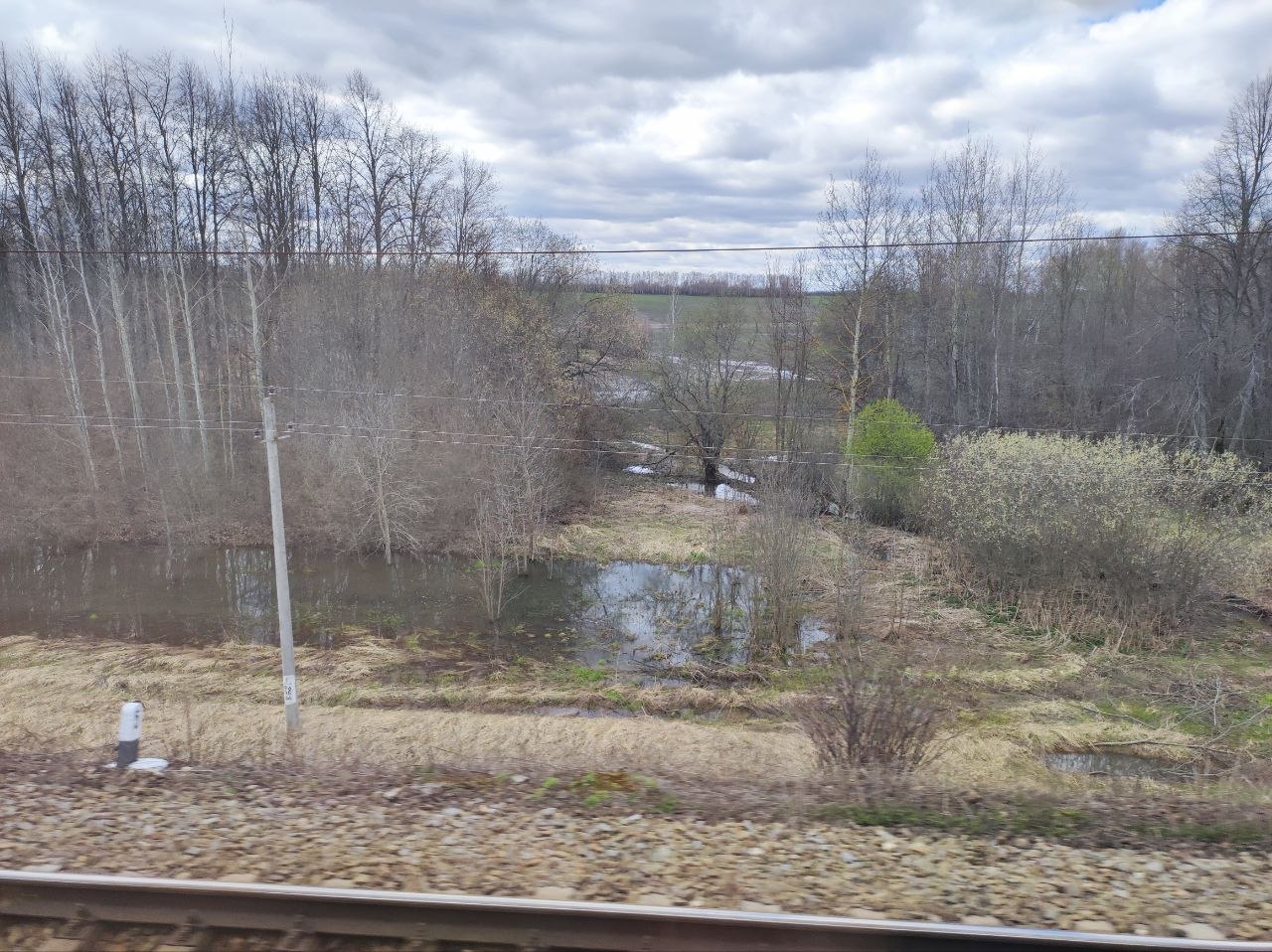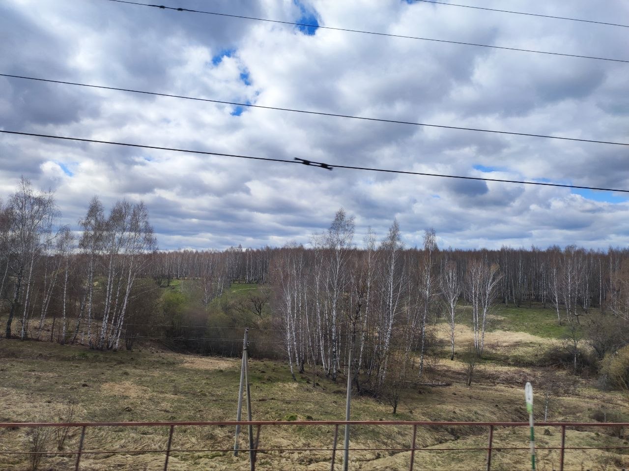 У нас уже бушует зелень, отцветают тюльпаны, сирень врывается в окна, а тут - чахлые перелески и рощицы Средней Руси, ещё не до конца стаявший снег, чёрная пугающая вода болотцев, бледные и беспомощные берёзки и осинки да засохшие с прошлого года заросли борщевика, с который и бороться-то уже бесполезно. Завезли его когда-то на эти бедные земли, чтобы было чем коровок кормить, а он возьми да и приживись - не справиться...