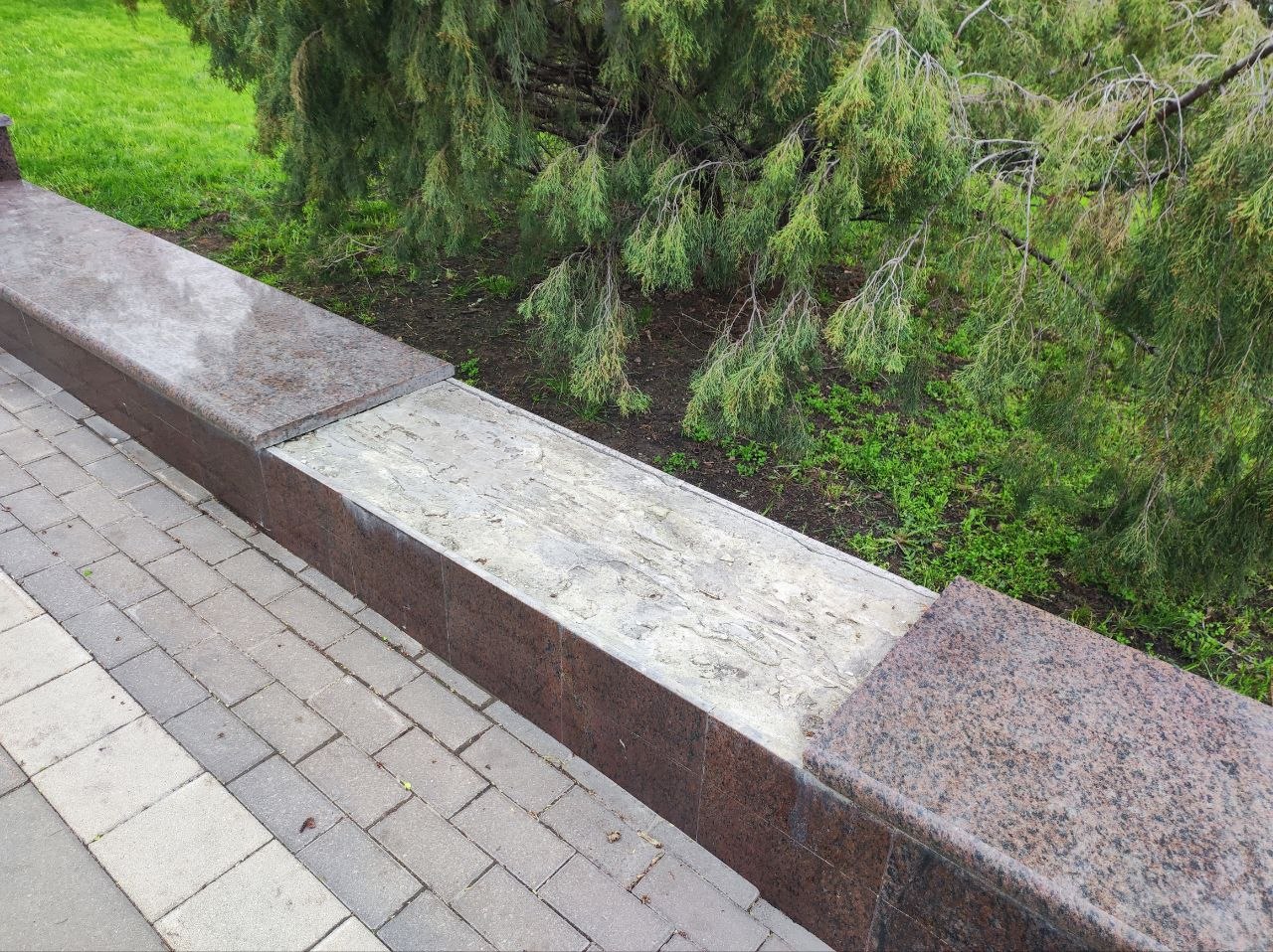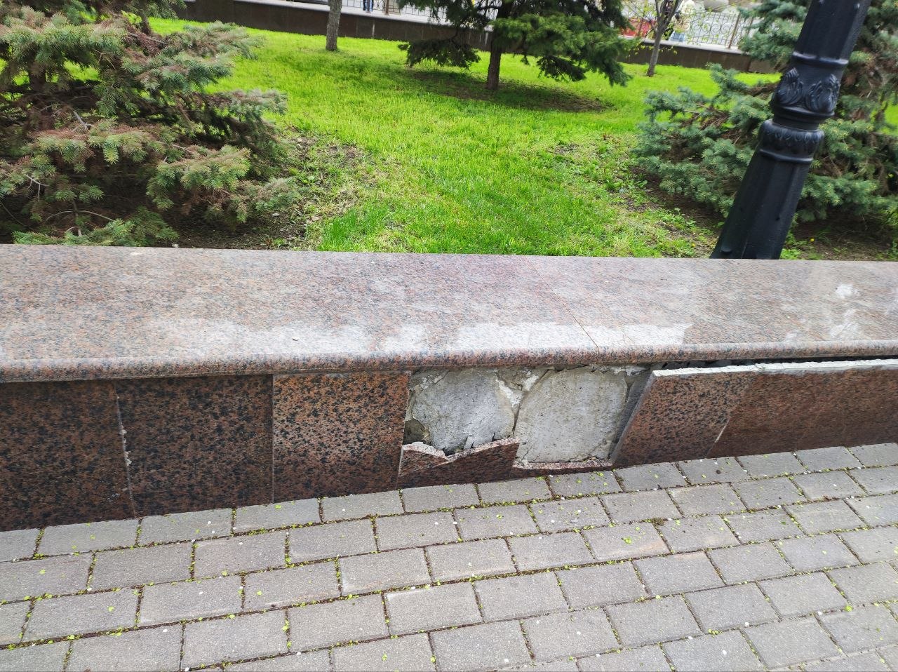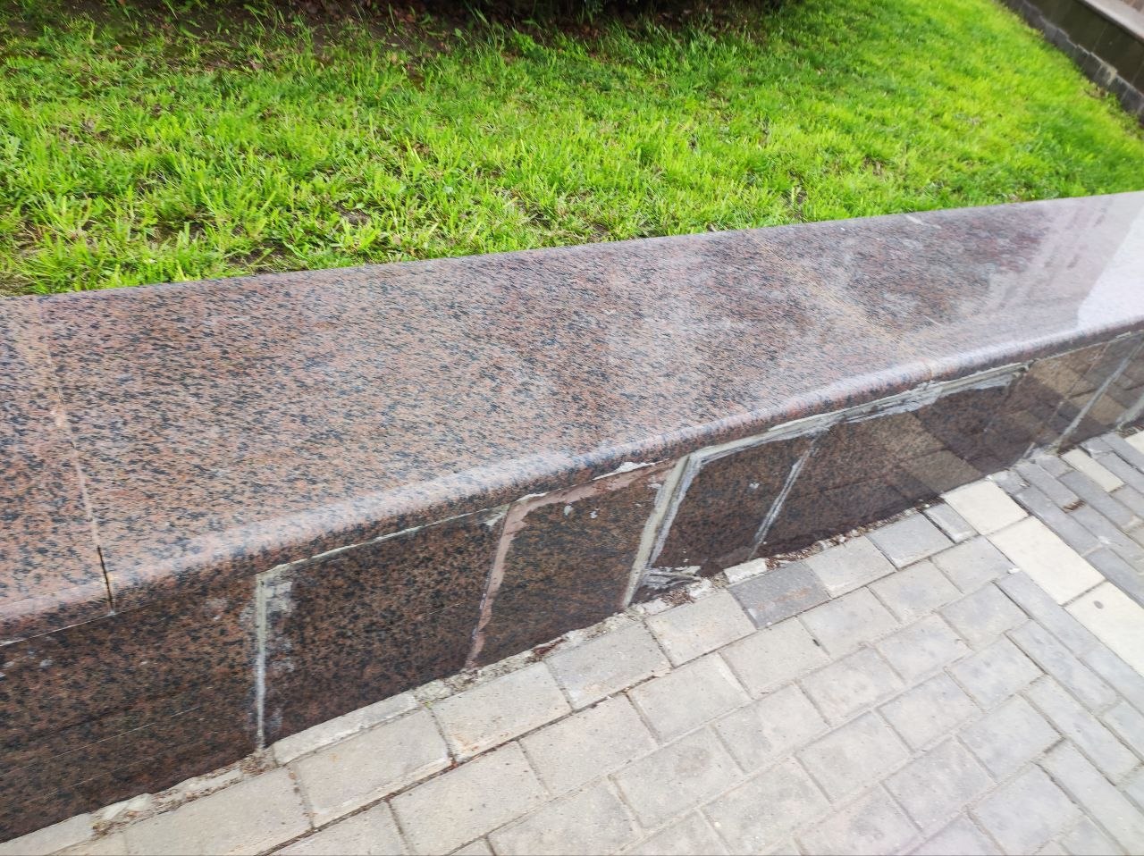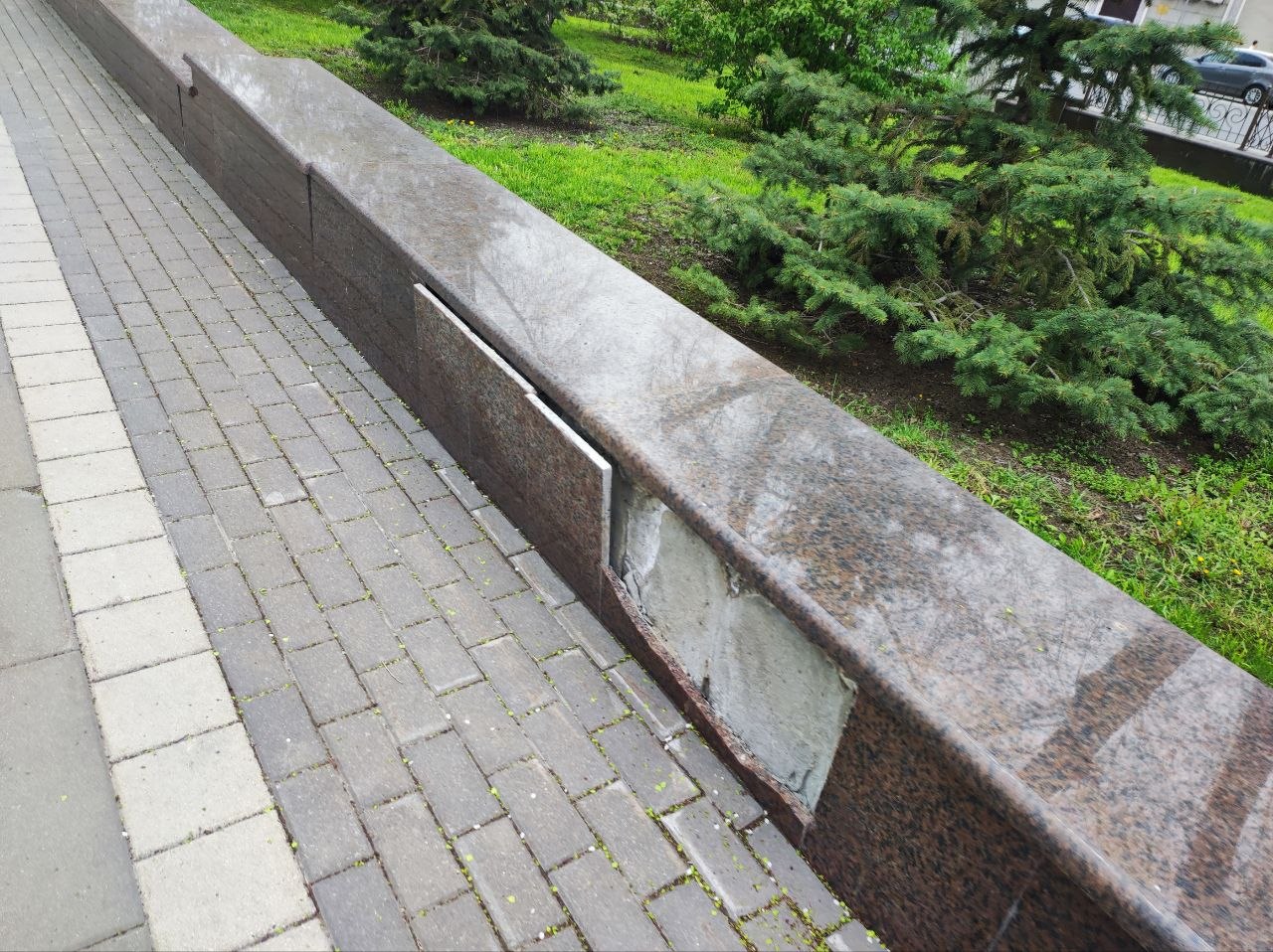 Фонари вандалы постоянно ломают, а то и вырывают с корнями. По разбитой плитке уже опасно ходить, а отбитый мрамор закрашивают подходящего цвета краской.