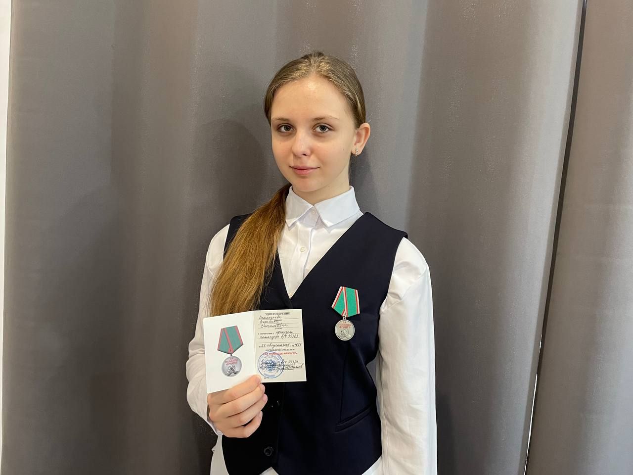 За свой вклад в общее дело приближения победы наших бойцов на специальной военной операции ученица 10-го класса Песчанокопской школы №2 Вероника Великоднева удостоена медали «За помощь фронту».