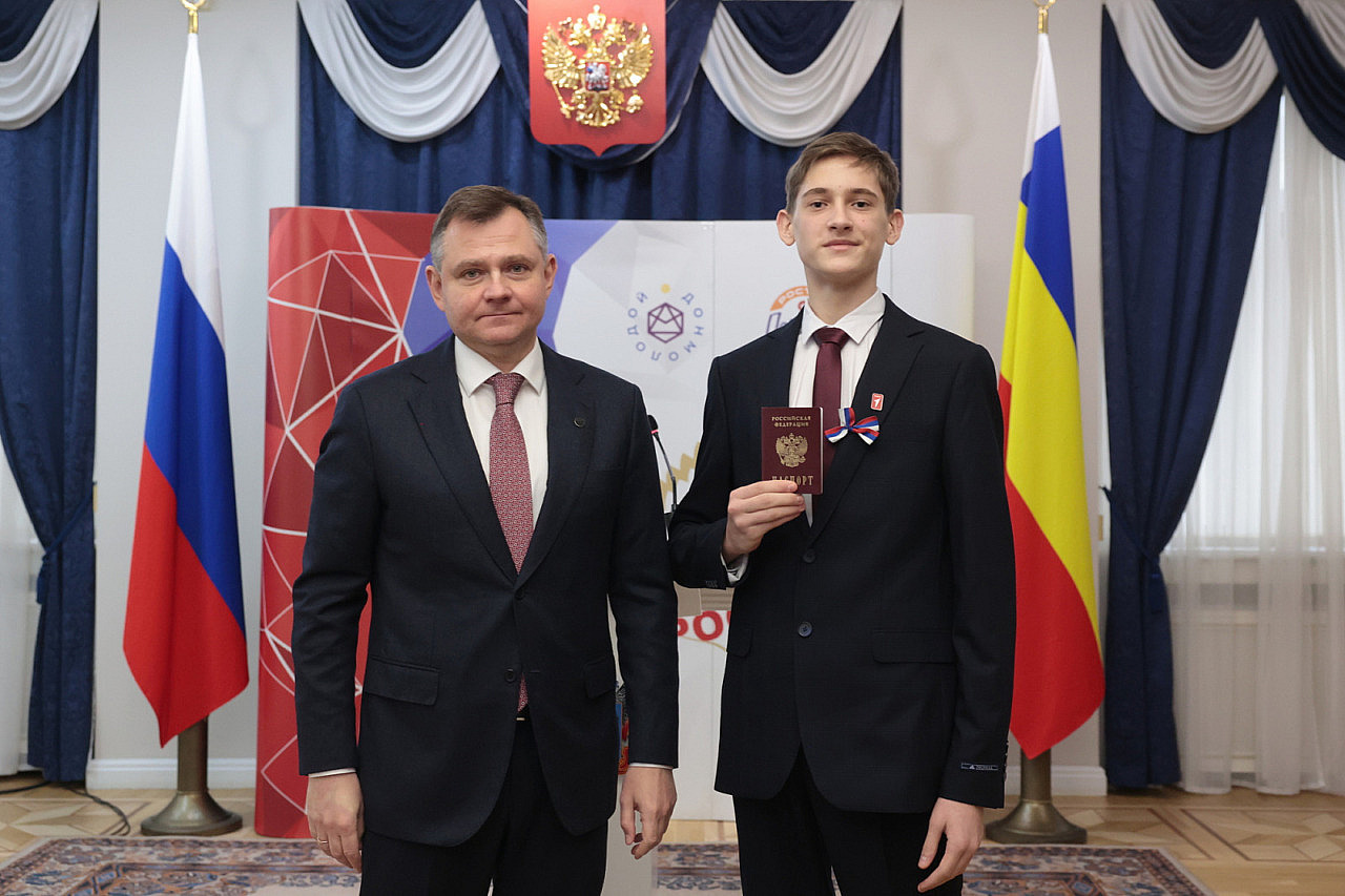 Глава региона вручил паспорта талантливым ученикам школ и лицеев Донского края. Все они – участники регионального «Движения первых».