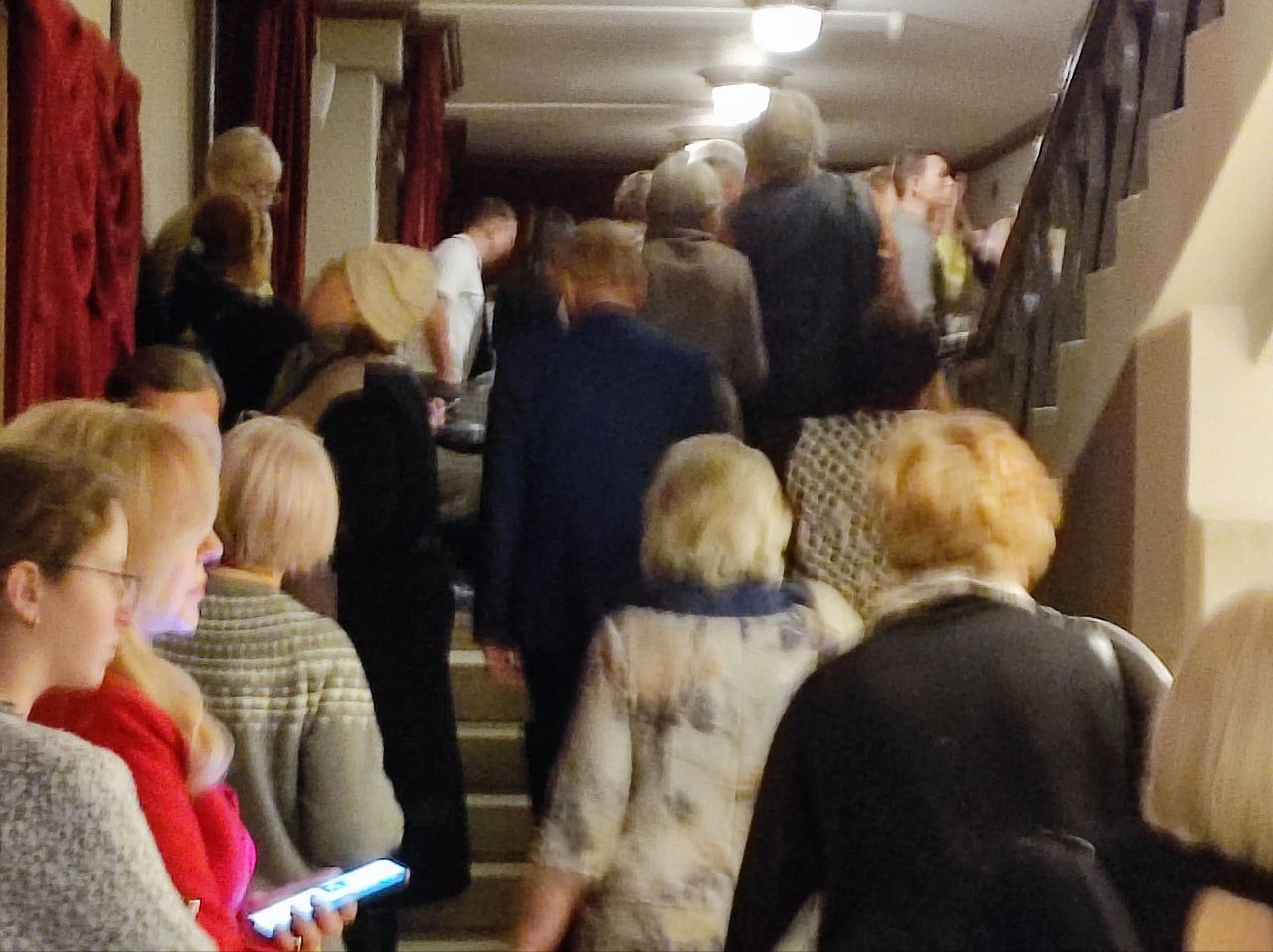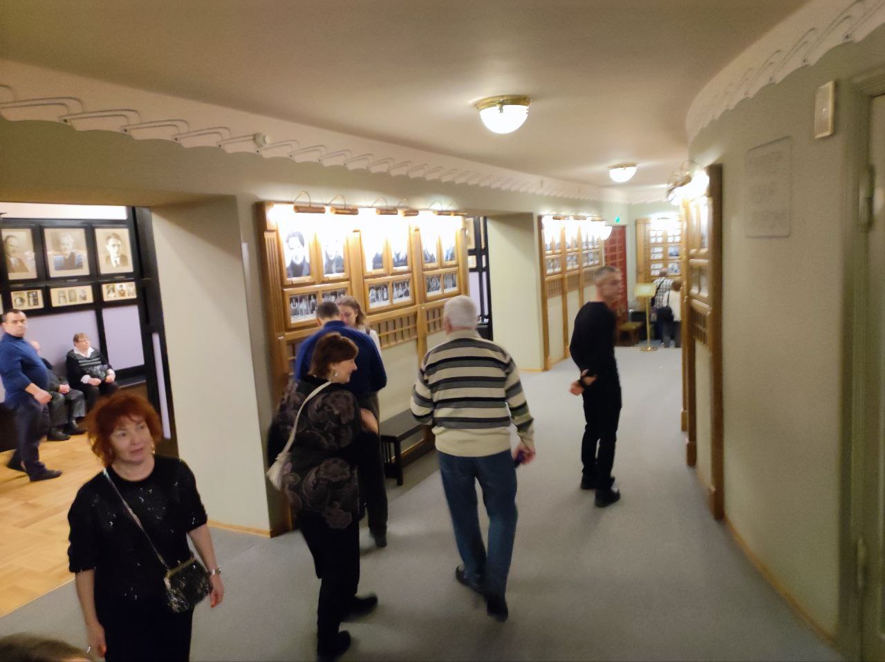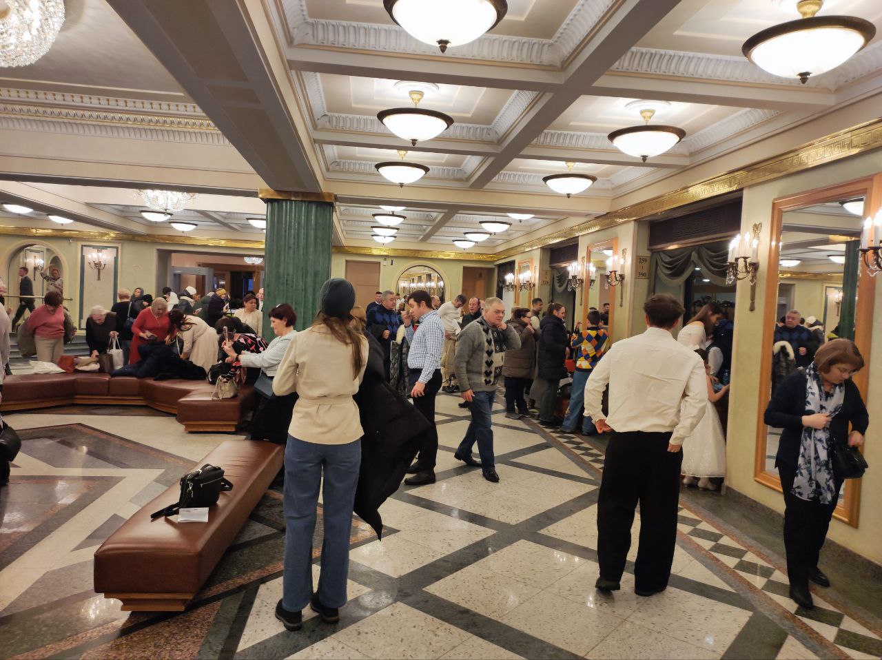 Сам по себе театр довольно тесный, хоть и красивый. Пространства для зрителей вне зала очень мало, в антракте столпотворение. Буфет без предварительного заказа столика вряд ли удастся посетить. Ну, и в основном на ногах.